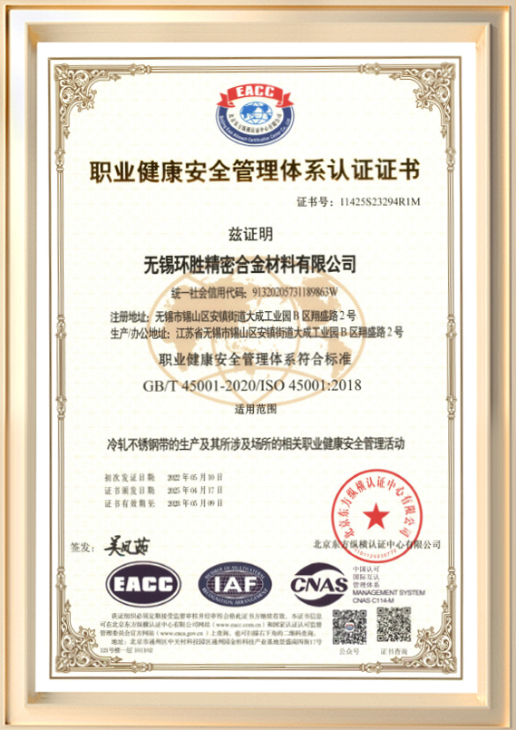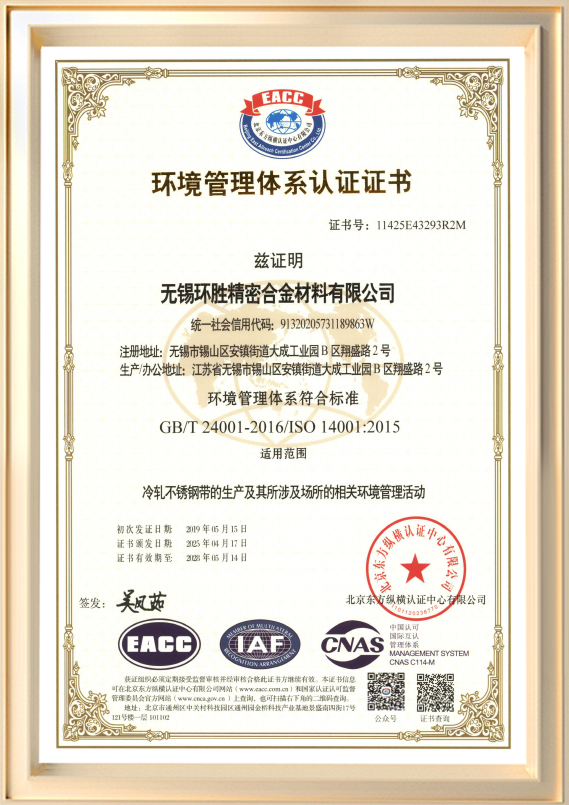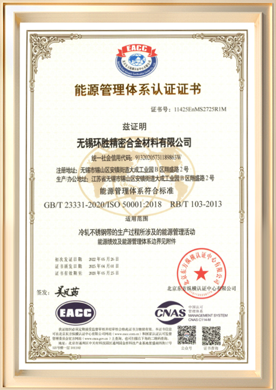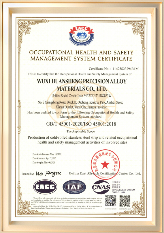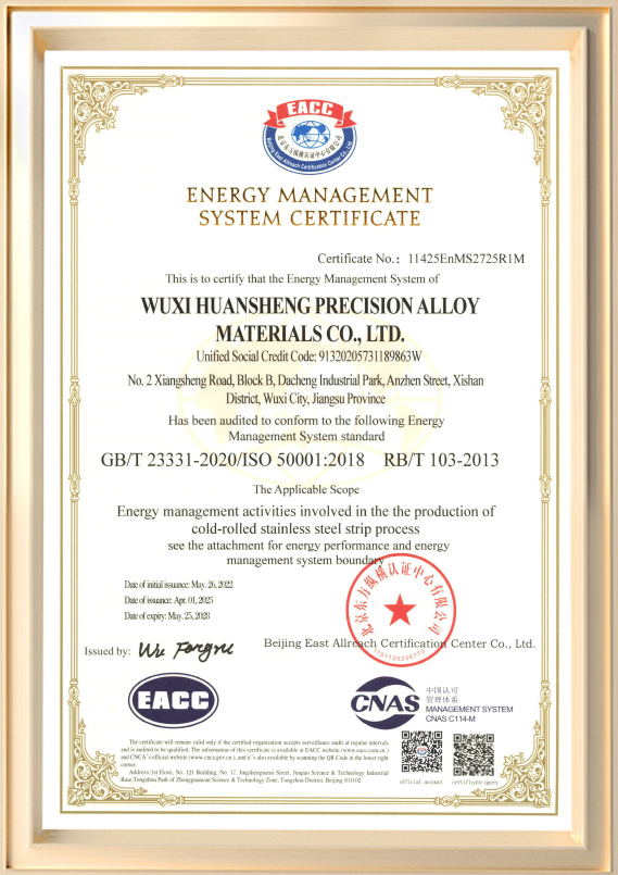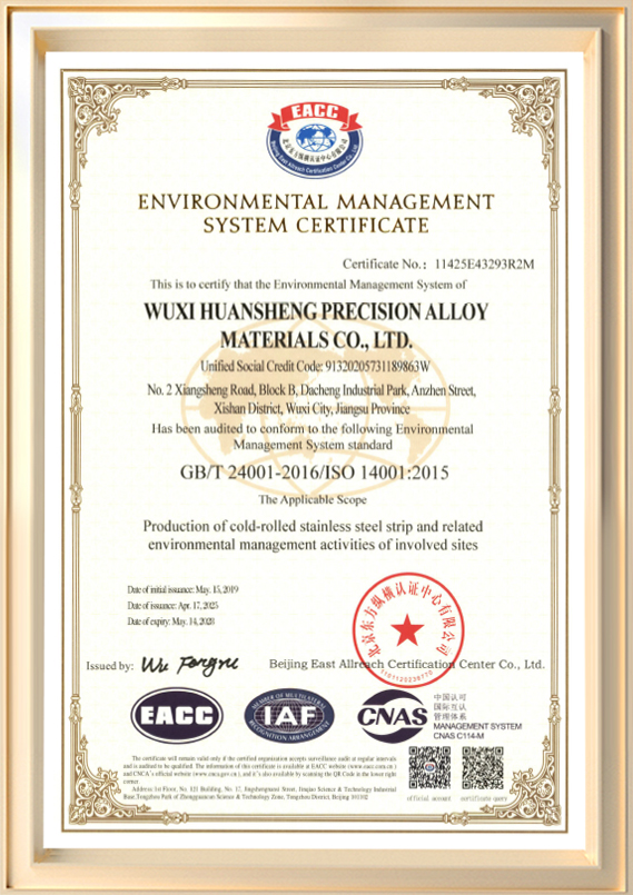 Fundada em 2001, Wuxi Huansheng Precision Alloy Materials Co., Ltd. (anteriormente Wuxi Huansheng Metal Produtos Co., Ltd.) é um fabricante especializado envolvido em pesquisa e desenvolvimento e produção de tiras de aço inoxidável laminadas a frio. A empresa possui capital social de 60 milhões de RMB e uma área fabril de aproximadamente 45.990 metros quadrados, com capacidade de produção anual de até 72.000 toneladas. a espessura do nosso produto varia de 0,03 mm a 3,0 mm, com largura máxima de 650 mm. Apoiada por uma forte equipe técnica e um moderno sistema de gestão, a empresa obteve diversas certificações internacionais, incluindo ISO 9001, ISO/TS 16949 e ISO 14001.